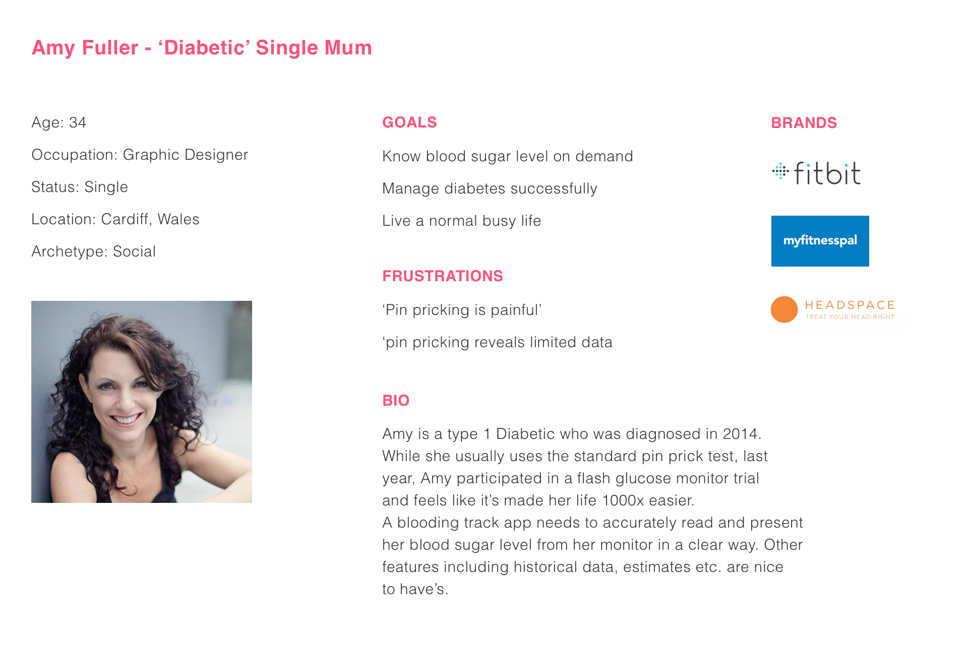 I then set out our ideal user, focusing in on the frustrations of diabetes and complex management tools.