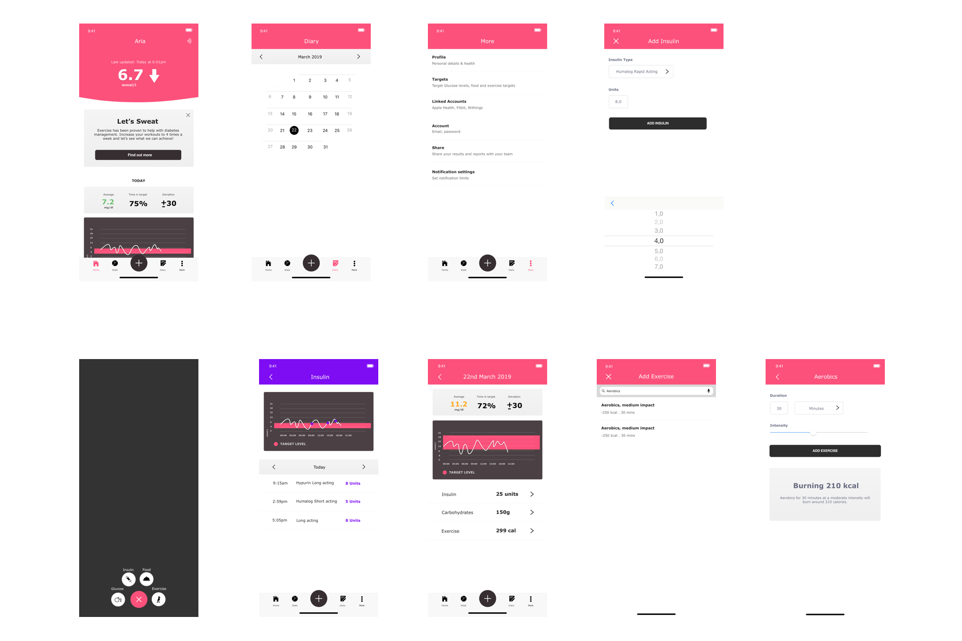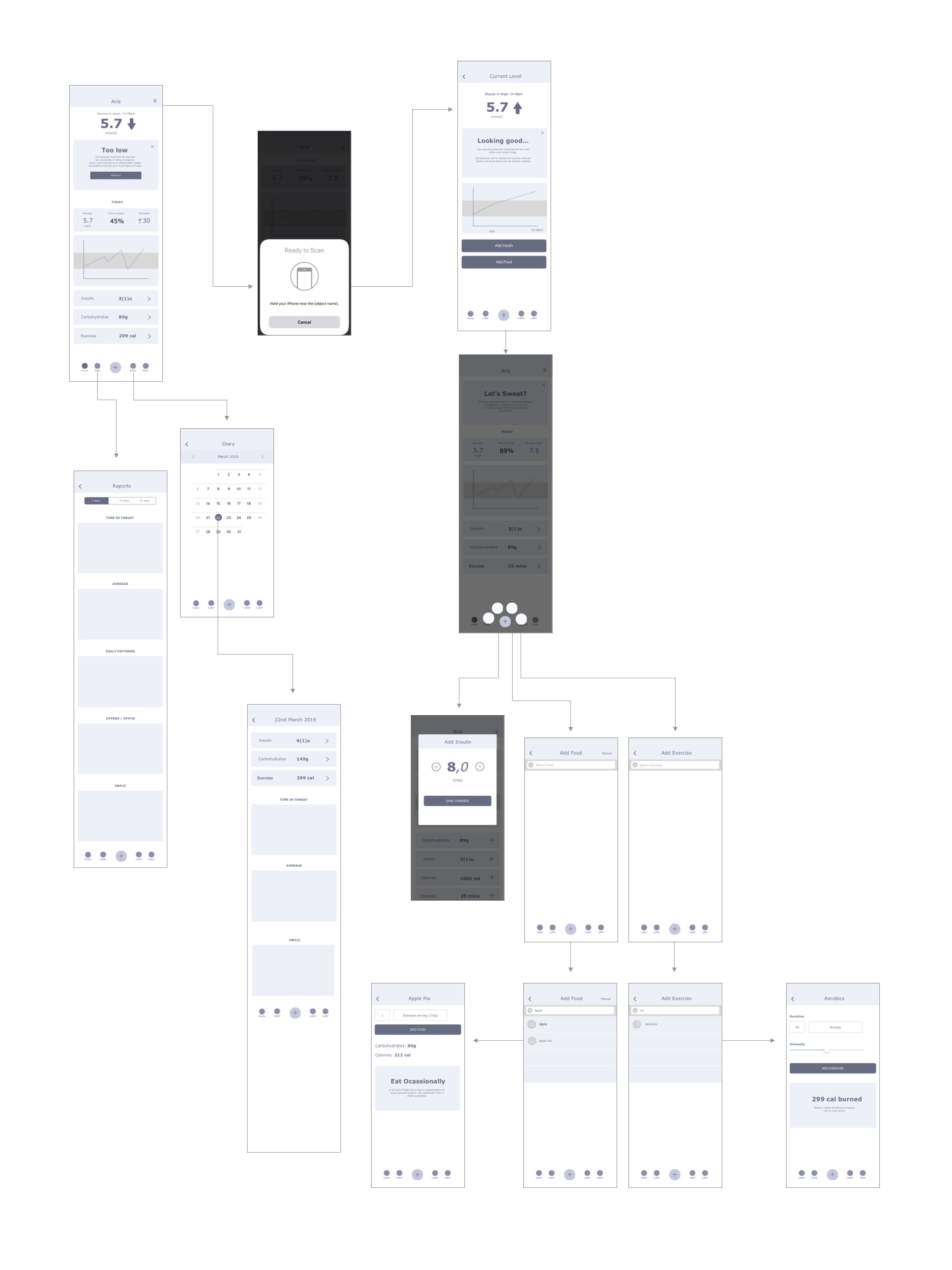 With the product and brand defined, I built the low fidelity wireframes into high fidelity UI designs in Sketch. I kept in line in with iOS Human Interface Guidelines as I wanted to ensure the product was as usable as possible. I also considered accessibility as the app could be used by people with a variety of disabilities. This is even more likely in the Diabetes market because the condition is linked to a number of conditions and difficulties including eyesight issues.